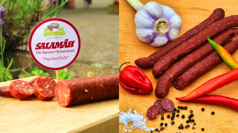Die Schafsalami SALAMÄH gibt es in vier leckeren Geschmacksrichtungen! Das Schaf- und Lammfleisch stammt von regionalen Schäfereien aus dem Naturpark Spessart, die gemäß dem Markenprogramm von Grünland Spessart zertifiziert sind. Ihre Schafe grasen tiergerecht auf regionalen Weiden. Diese Kombination garantiert eine hohe Fleischqualität, kurze Transportwege und eine handwerkliche Verarbeitung.