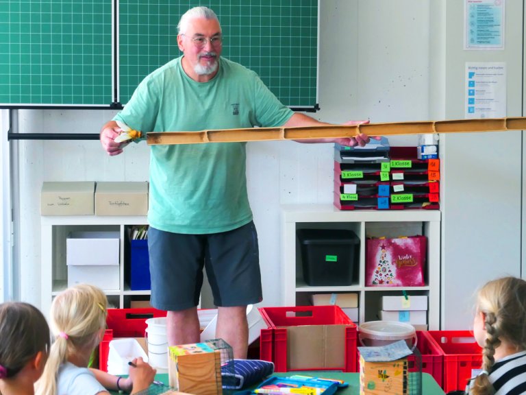 Begeistert lauschten die Schülerinnen und Schüler der gemischten Klasse 1/2 dem Wildbienen-Didi. So wird Dozent Dietmar Kampfmann aus Reichenbach von allen genannt, denn seine Leidenschaft sind Wildbienen und deren Schutz.