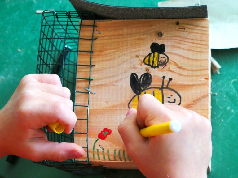 Nach der Theorie durfte jedes Kind ein eigenes Wildbienenhotel bauen; richtige Kunstwerke wurden daraus. Zum großen Finale ging es in den Schulgarten zum Bienenstreicheln.