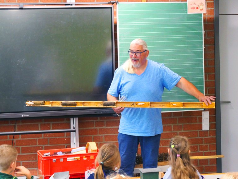 Zwischen Hämmern, Streichen und Staunen erklärte „Didi“ anschaulich das Leben der Wildbienen – von der Eiablage über die Verpuppung bis zum fertigen Insekt. Mit einem selbstgebauten Modell zeigte er den Kindern, wie sich aus einem Ei über Monate hinweg eine Biene entwickelt. „Viele wussten schon richtig viel – das hat mich wirklich beeindruckt“, lobte Kampfmann. Auch dass einige Arten sogar in Schneckenhäusern nisten, sorgte für große Augen.